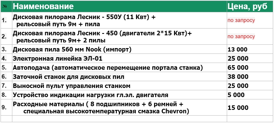 | 1. | Дисковая пилорама Лесник - 550У (11 Квт) + рельсовый путь 9м + пила | по запросу |